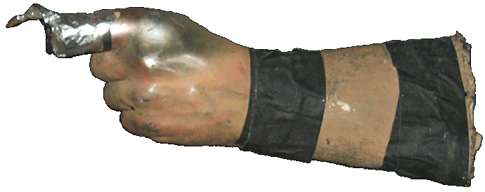 This is one of many hand-prosthetics that were made for Robert Patrick to be used in the scenes, where the T1000 extends a finger. The item has suffered a lot from extensive use...